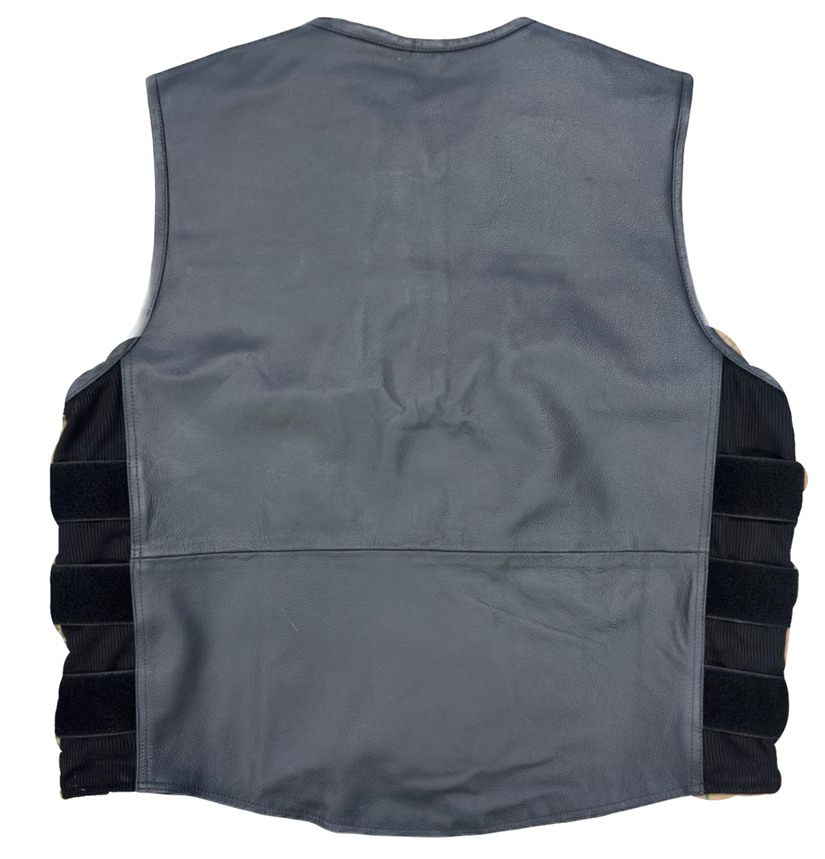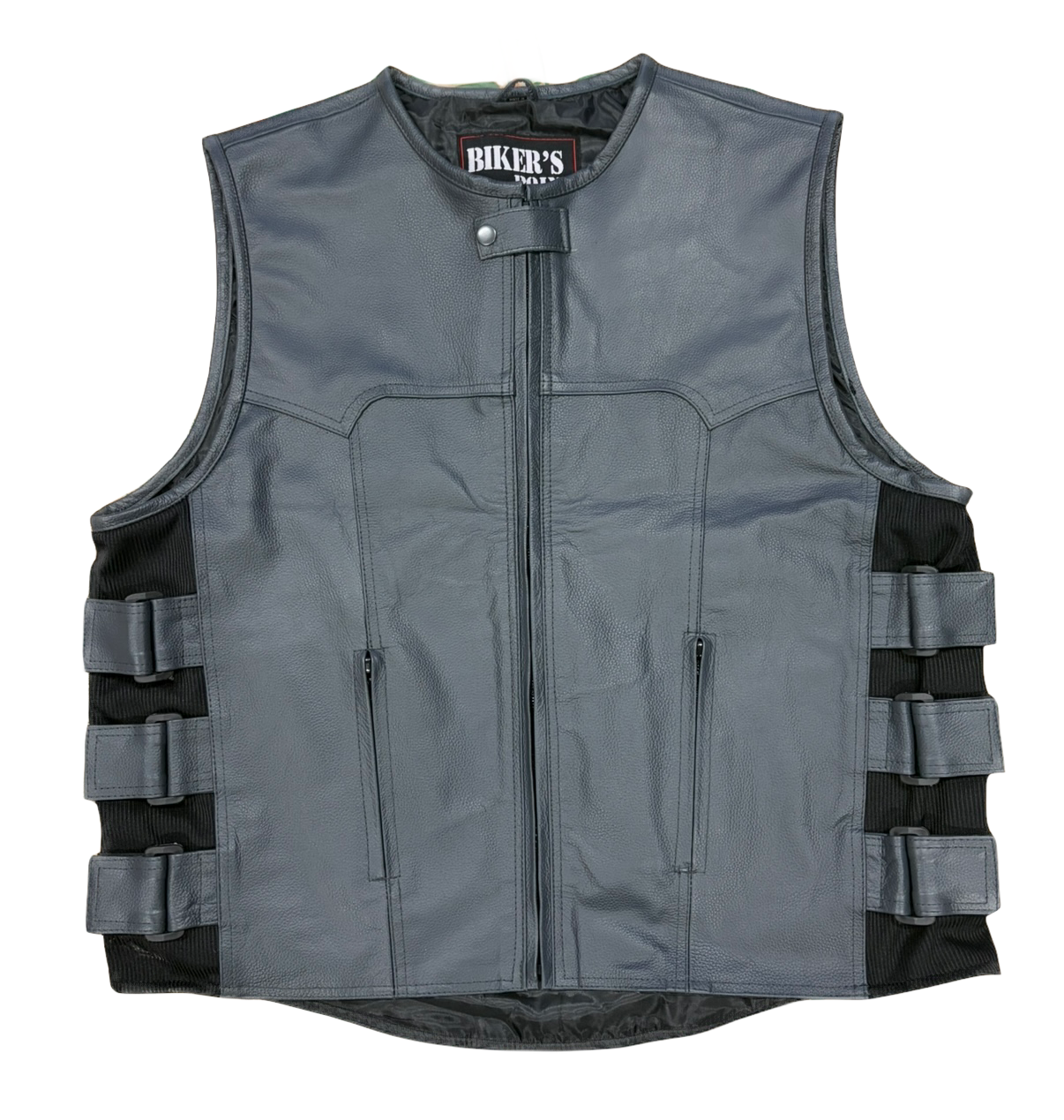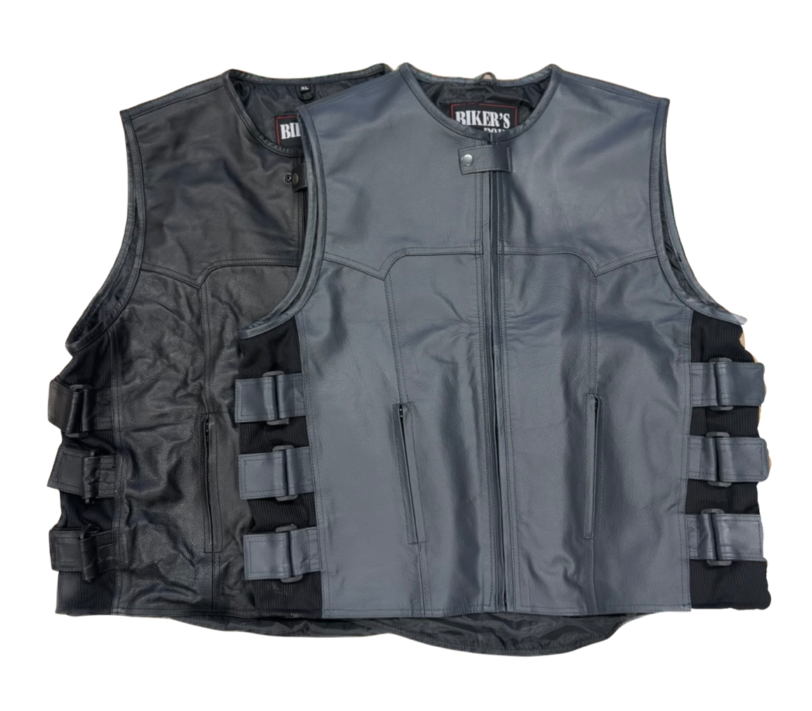 This is our police style leather vest in the color charcoal. We recommend you go 1 size up from whatever men’s size shirt you wear unless you’re a small or medium. Please view the final picture so you may better see the difference between the color charcoal and black leather.